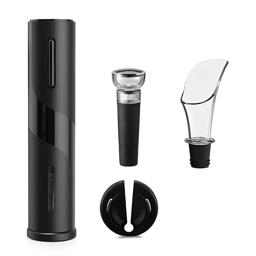 Kit Abridor de Vinhos Saca Rolhas Elétrico Automático, ideal para quem busca praticidade na hora de abrir uma garrafa de vinho. O abridor funciona de forma automática e permite abrir a garrafa em até 7 segundos, apenas pressionando um botão, sem esforço.