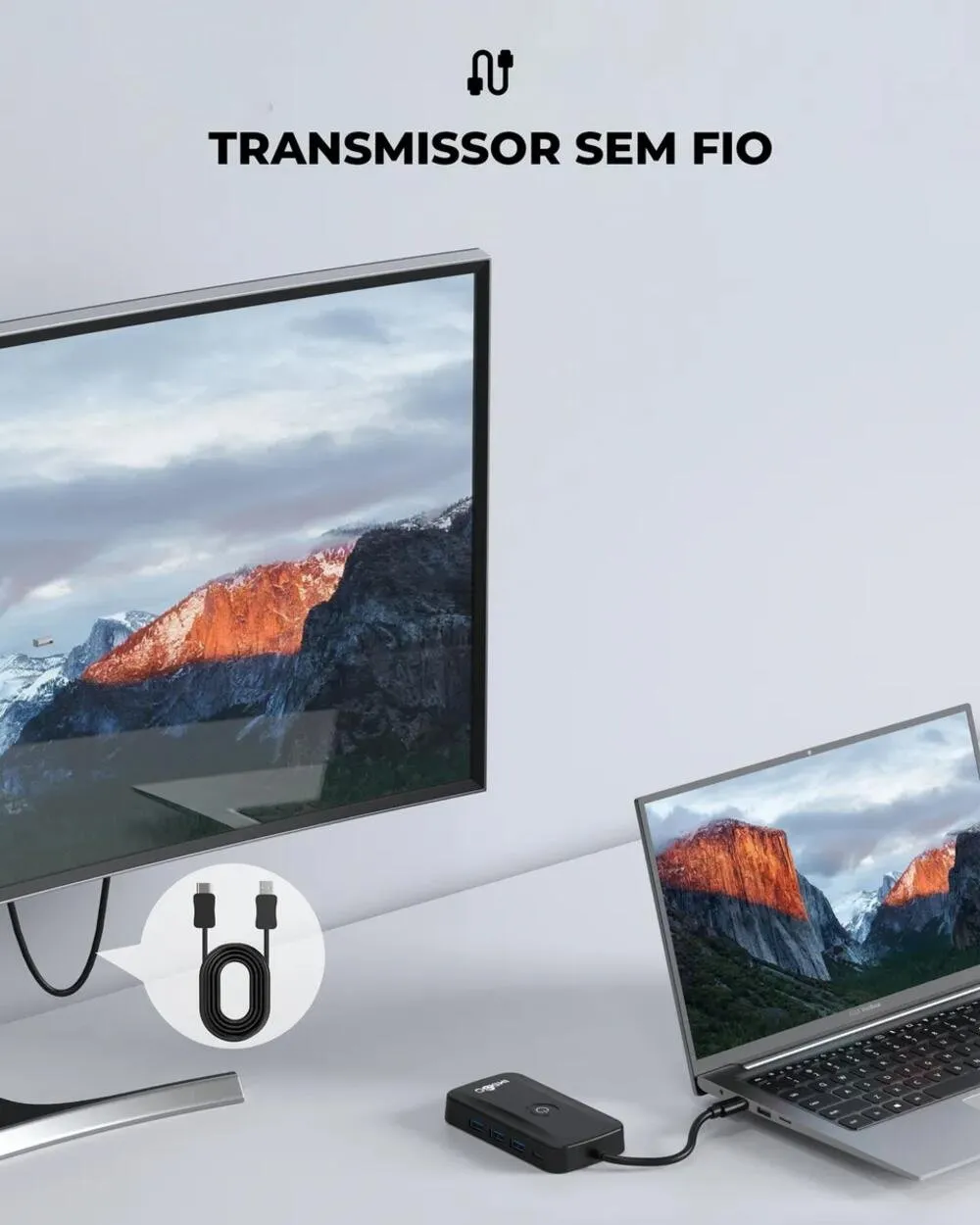 Conta com design compacto e construção resistente, permitindo fácil transporte e instalação rápida no dia a dia. Além da função de transmissão sem fio via HDMI, o modelo também pode oferecer múltiplas conexões adicionais, como portas USB e entrada Type-C com suporte a carregamento rápido Power Delivery, ampliando a conectividade e a versatilidade do dispositivo.