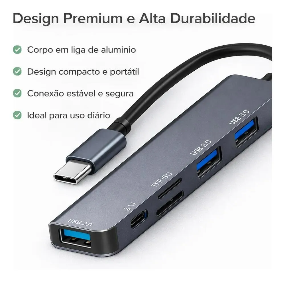 Hub de conexão desenvolvido para ampliação de portas e leitura de cartões de memória, utilizando interface USB-C para conexão ao dispositivo principal.