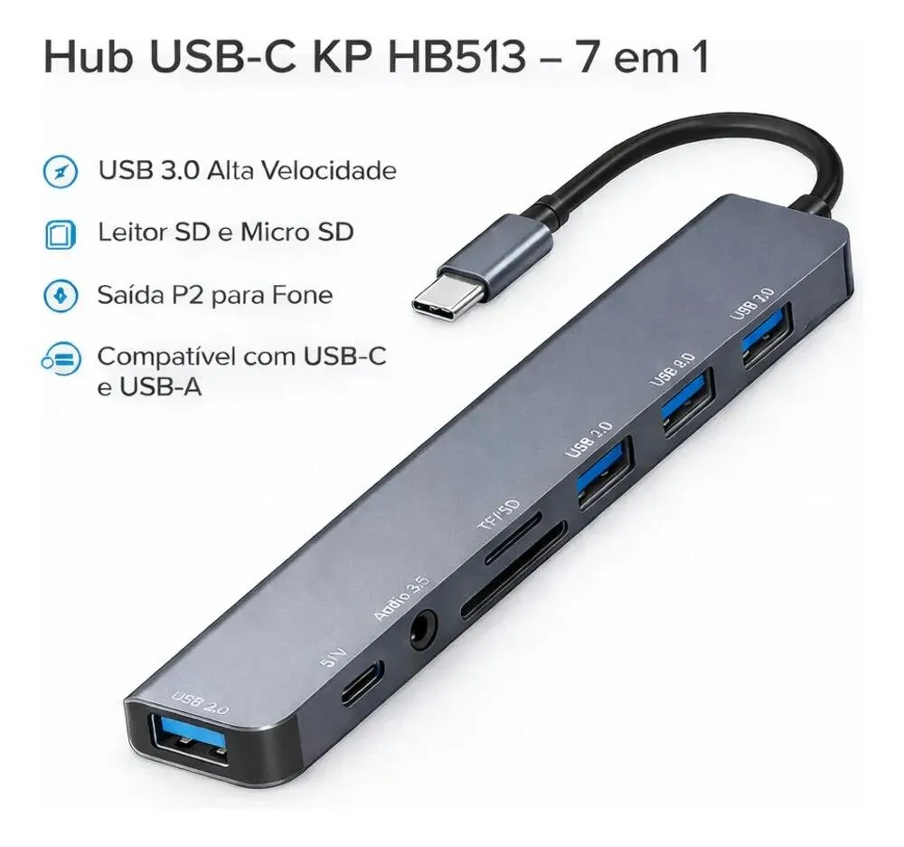 O produto reúne múltiplas funções em um único equipamento, permitindo a conexão de dispositivos compatíveis por meio de portas USB, além de possibilitar a leitura de cartões de memória SD e Micro SD.