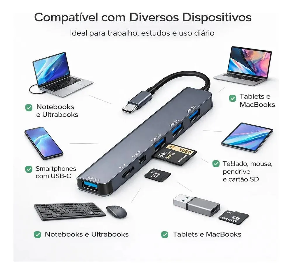 Sua aplicação é voltada ao uso com computadores e dispositivos compatíveis com entrada USB-C, sendo indicado para ambientes residenciais, comerciais ou profissionais que necessitam de expansão de conectividade e leitura de cartões.